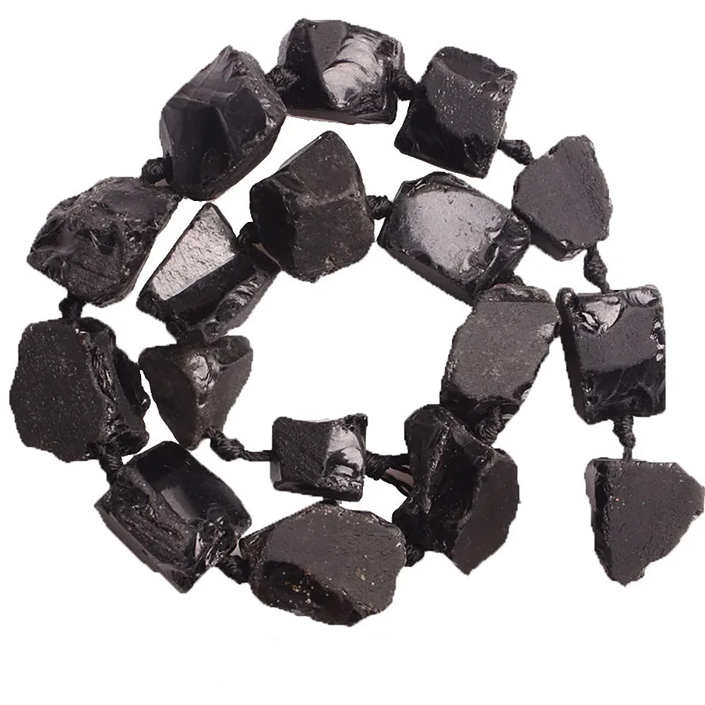Обсидиан черный, необработанные бусины 20-28 мм, на нитке 38 см