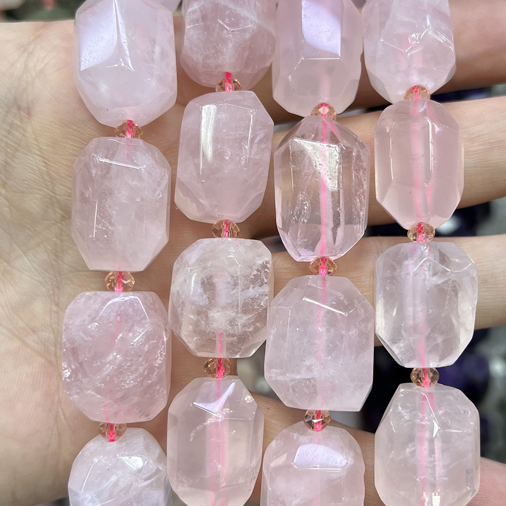Розовый кварц бусины 10/15х20/25 мм, крупная грань, нитка 38 см